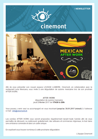 Immer aktuell! Schreiben Sie sich für den Newsletter der Cinemont (nur in französischer Sprache) ein, und erhalten Sie 1 x pro Monat die aktuellsten Informationen zu unseren Filmen, Neuigkeiten betreffend kommende Events und Promotionen sowie unser Top-Ratschlag! Sind Sie neugierig wie unser Newsletter aussieht?