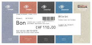 Pensez aux bons de cinéma pour des petites attentions toujours très attendues et appréciées à tout âge! Les bons sont valables 2 ans dans nos salles de cinéma cinemont 1/2/3/4, mais également dans les salles de cinéma de La Chaux-de-Fonds (Scala 1/2/3, Plaza et Eden), Neuchâtel (Apollo 1/2/3, Arcades, Rex, Studio et Bio), Bienne (Beluga, Apollo, Rex 1/2 et Lido 1/2), et Berne (salles de cinéma Quinnie : Cinebubenberg, Cinecamera, Cineclub, Cinemovie 1/2) Nous vous proposons les bons suivants :